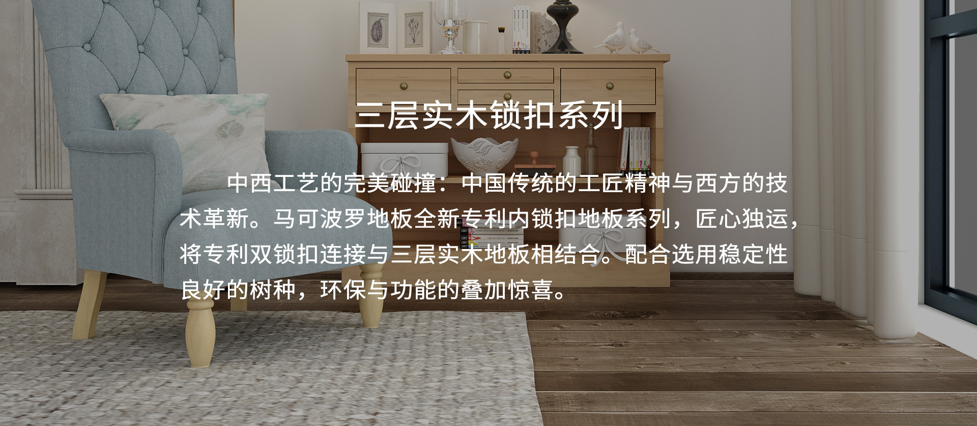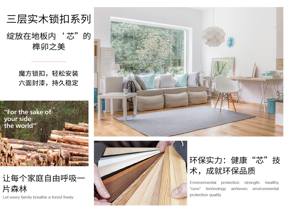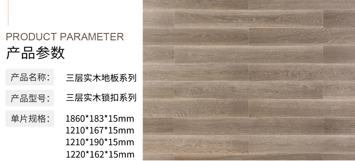 三层实木锁扣系列,执行严苛的欧洲木地板标准,实现了“热天不起拱、冷天不扒缝”。多种款式,多样花纹,铺就一片时尚个性的快乐天地。在现代品味生活中,为家居添上浓厚的异域色彩,为实现马可波罗至美家居的理想增添助力。