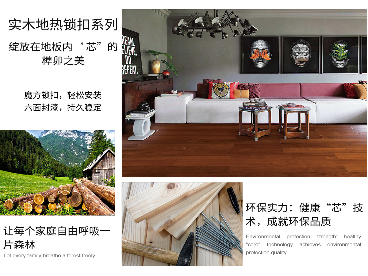 实木地热锁扣系列,执行严苛的欧洲木地板标准,实现了“热天不起拱、冷天不扒缝”。多种款式,多样花纹,铺就一片时尚个性的快乐天地。在现代品味生活中,为家居添上浓厚的异域色彩,为实现马可波罗至美家居的理想增添助力。