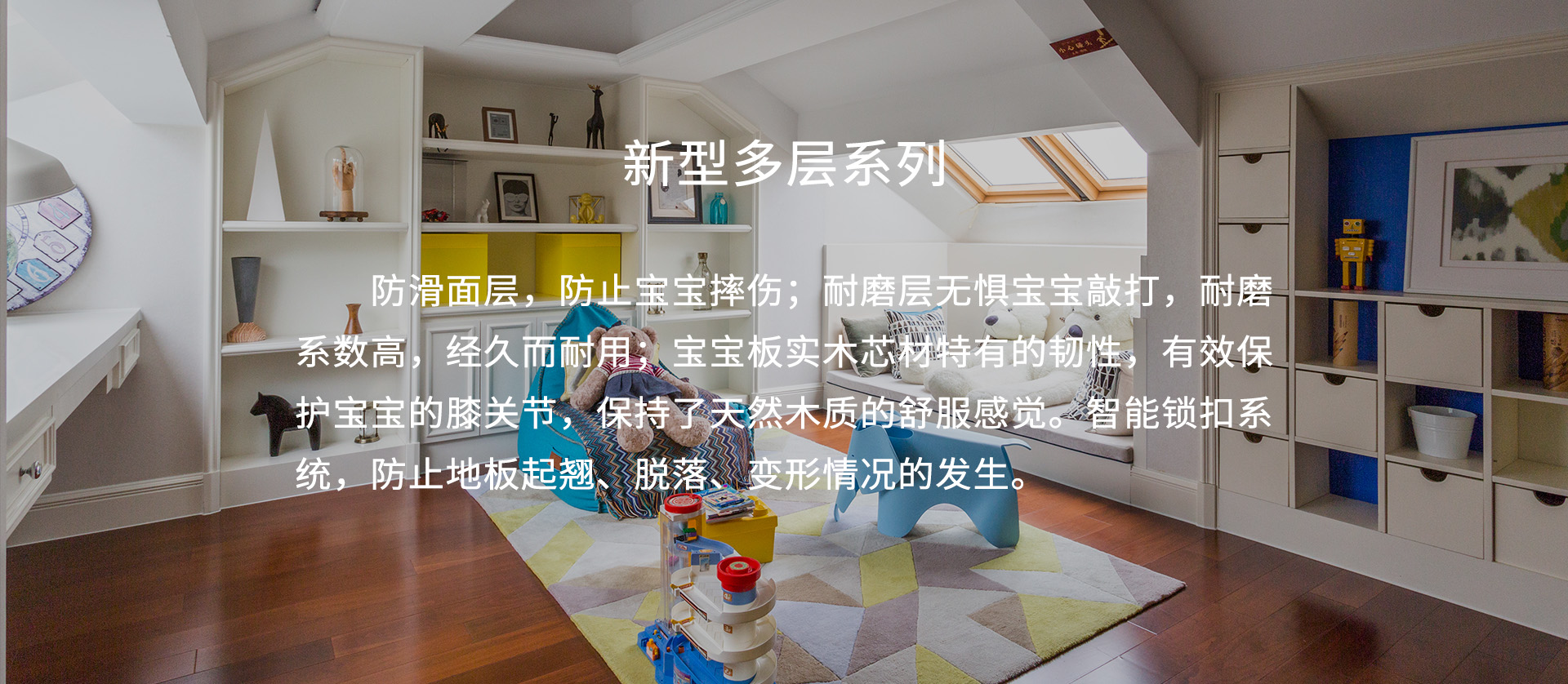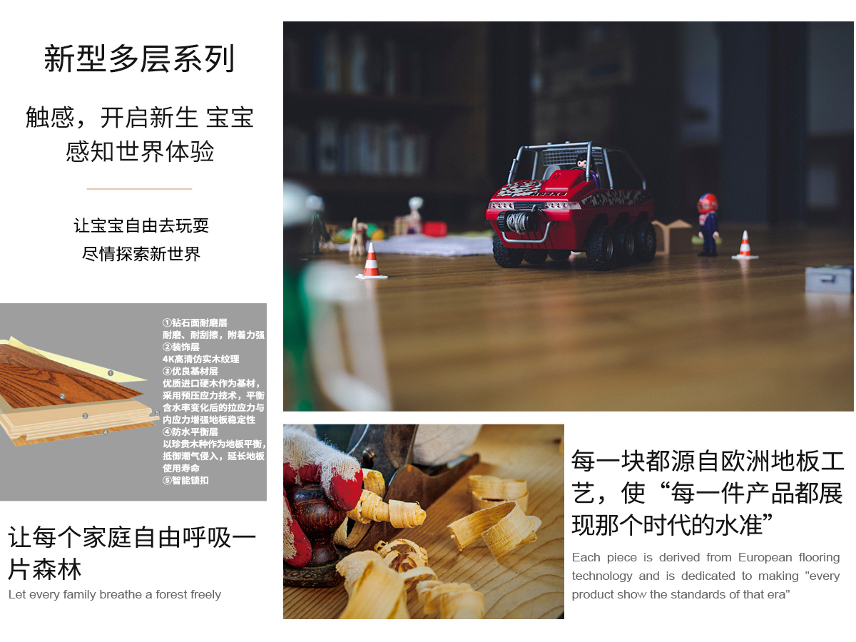 宝宝板系列地板,执行严苛的欧洲木地板标准,防滑面层,有效防止宝宝摔伤;宝宝板实木芯材的韧性,保护宝宝的膝关节,铺就一片快乐天地。在现代品味生活中,呵护宝宝健康成长,为实现马可波罗至美家居的理想增添助力。