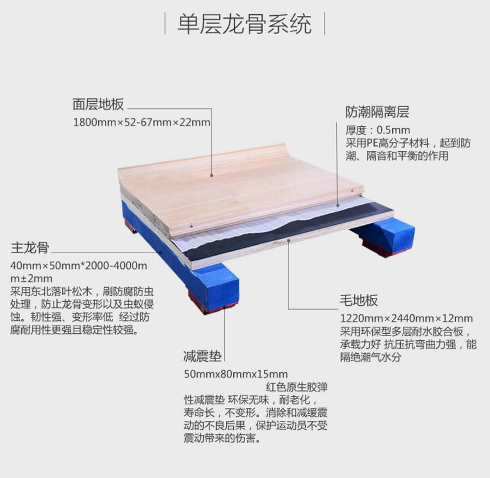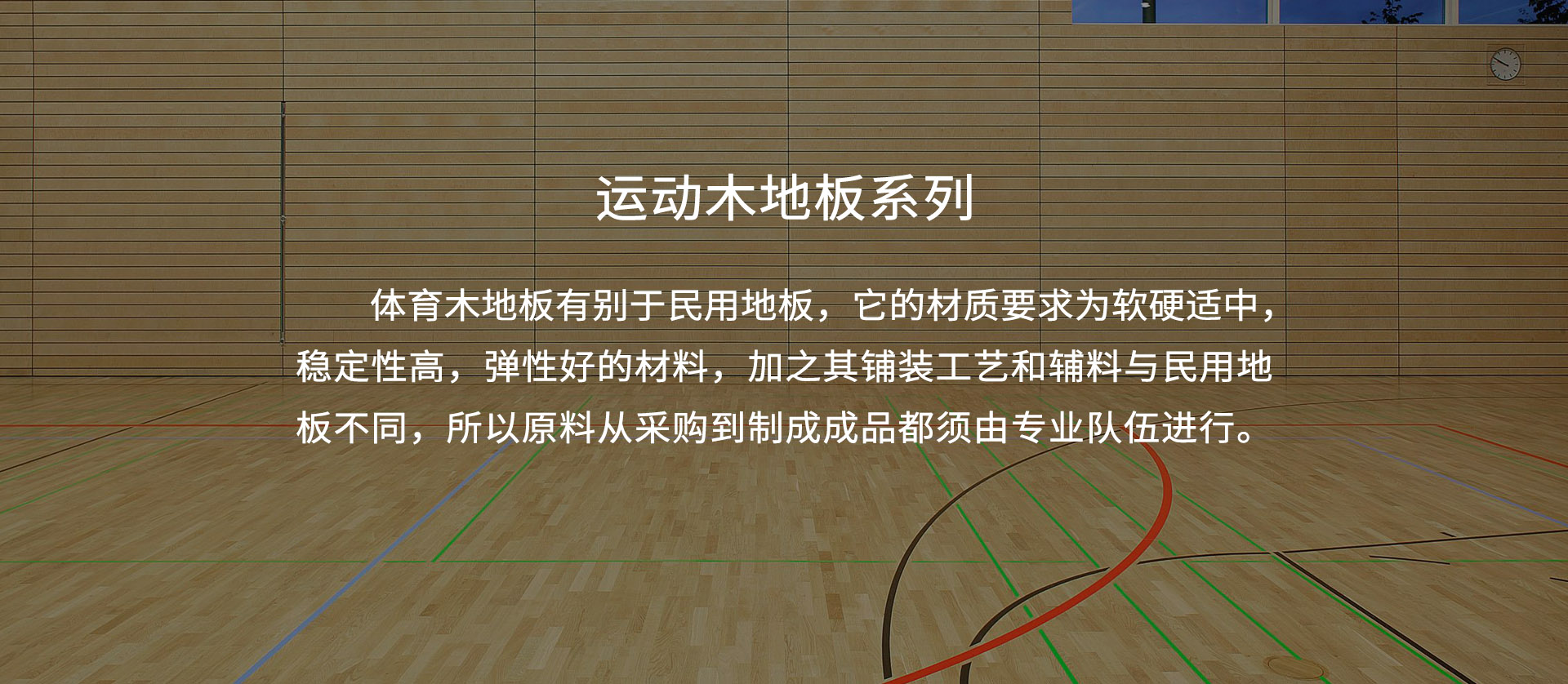 体育木地板有别于民用地板,它的材质要求为软硬适中,稳定性高,弹性好的材料,加之其铺装工艺和辅料与民用地板不同,所以原料从采购到制成成品都必须由专业队伍进行。