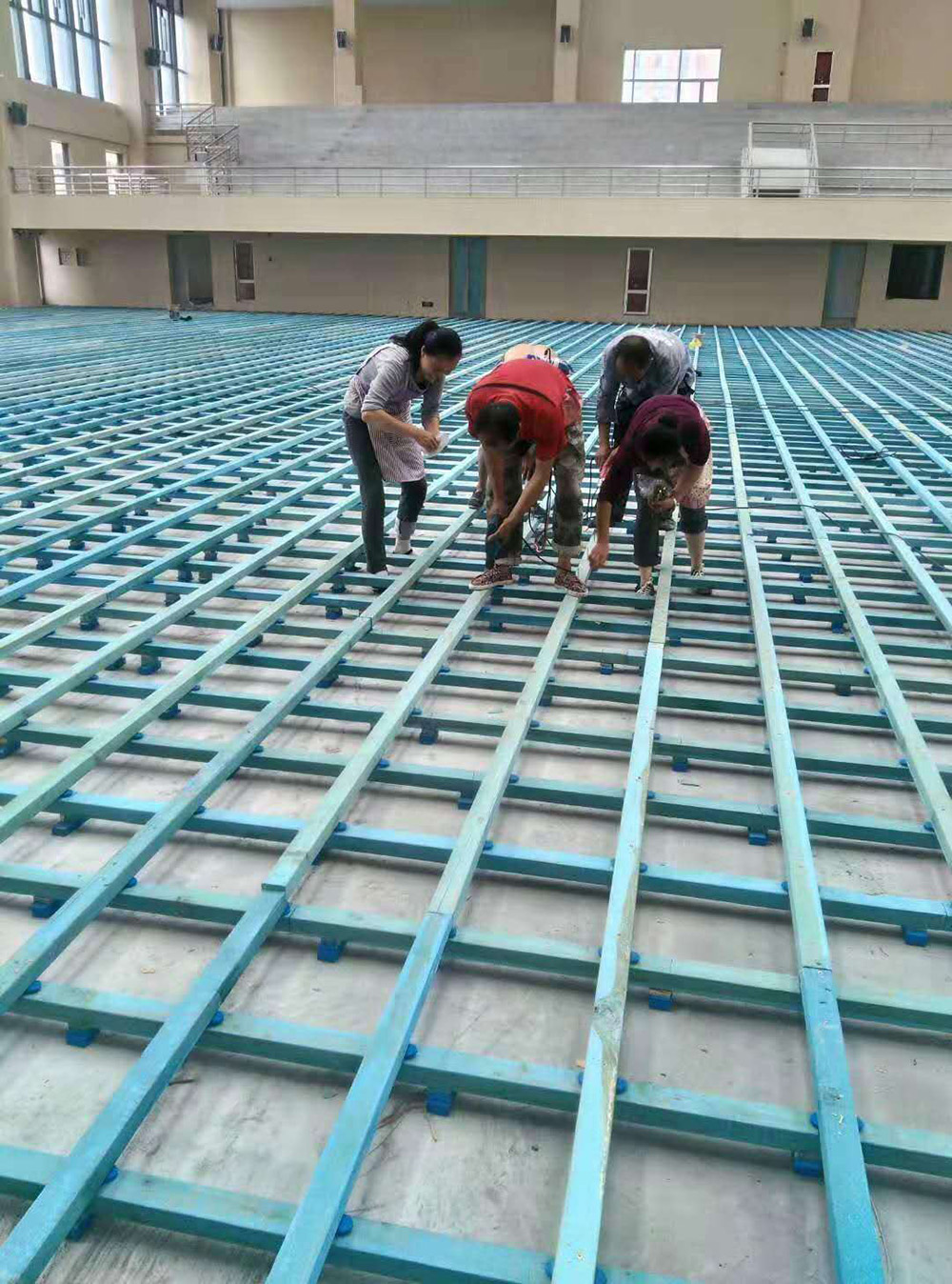 在完成上述工作量后,可进行面板安装,面板的安装基本要求是纵向是场馆的长面,侧向应是场馆的宽面,以减少地板伸缩膨胀率。