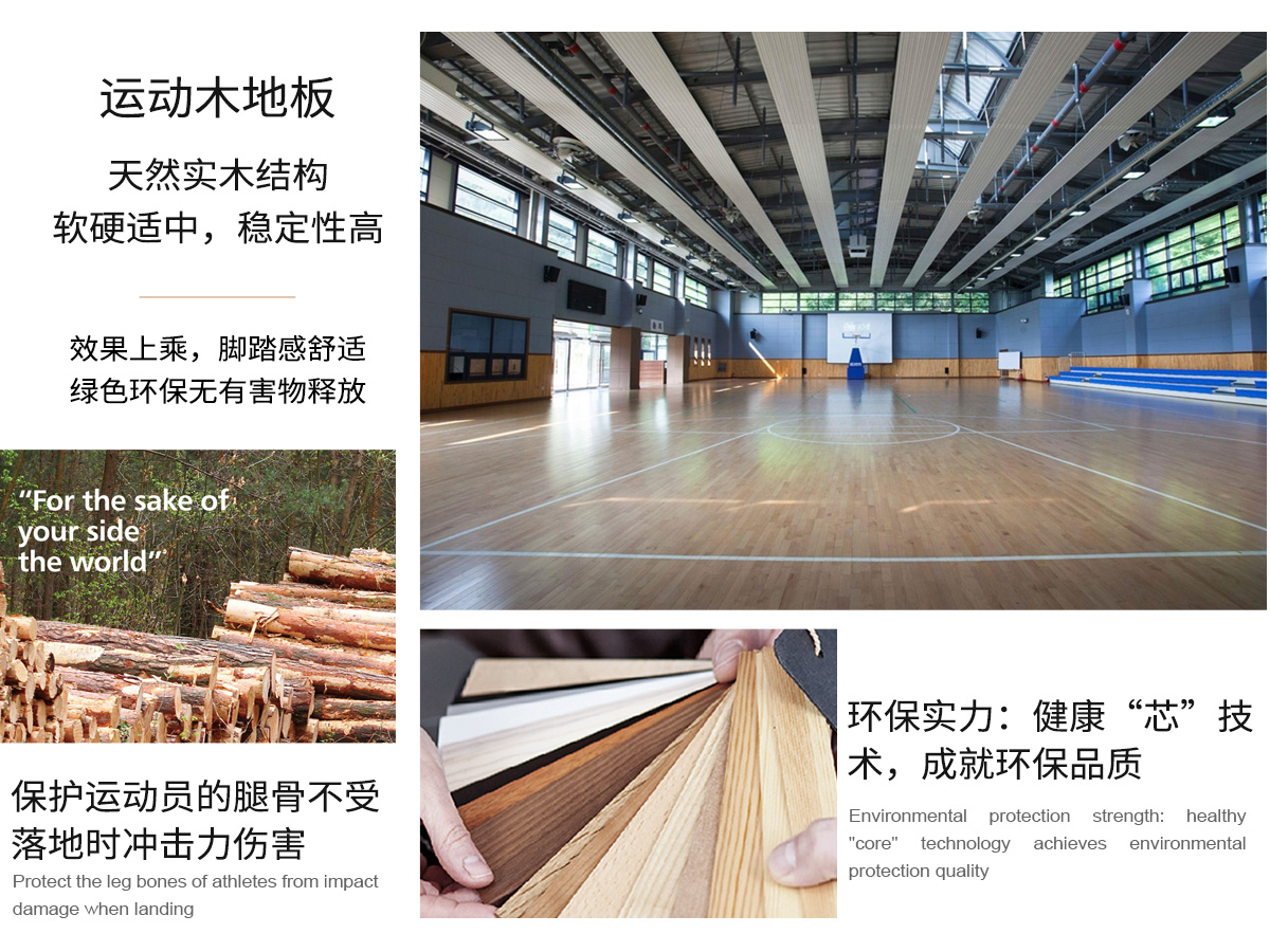 运动木地板系列,采用天然实木结构,使用优质木材原木加工,使用效果上乘,脚踏感舒适;在设计中又采用了天然橡胶制作的橡胶找平减震垫,可大量吸收人们在运动中所产生的冲击力,从而有效的保护了运动员,使该结构产生了较佳脚感和舒适性。